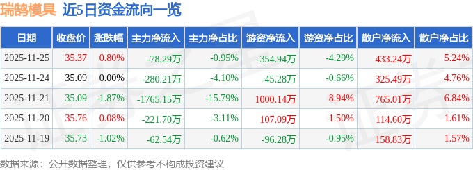 证券之星消息,截至2025年11月25日收盘,瑞鹄模具(002997)报收于35.37元,上涨0.8%,换手率1.12%,成交量2.34万手,成交额8274.92万元。