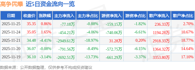 证券之星消息,截至2025年11月25日收盘,高争民爆(002827)报收于35.35元,上涨0.86%,换手率0.9%,成交量2.48万手,成交额8744.62万元。