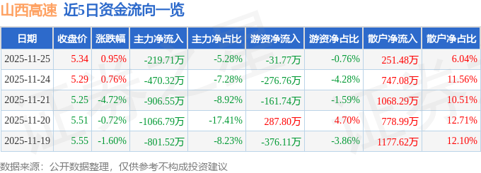 证券之星消息,截至2025年11月25日收盘,山西高速(000755)报收于5.34元,上涨0.95%,换手率0.53%,成交量7.8万手,成交额4163.82万元。