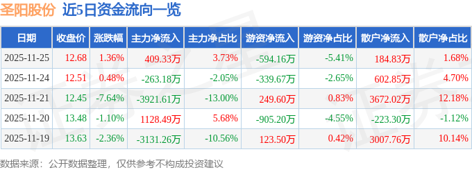 证券之星消息,截至2025年11月25日收盘,圣阳股份(002580)报收于12.68元,上涨1.36%,换手率1.92%,成交量8.67万手,成交额1.1亿元。