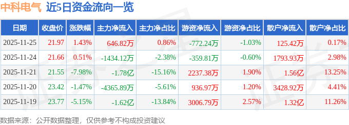 证券之星消息,截至2025年11月25日收盘,中科电气(300035)报收于21.97元,上涨1.43%,换手率5.8%,成交量33.84万手,成交额7.49亿元。