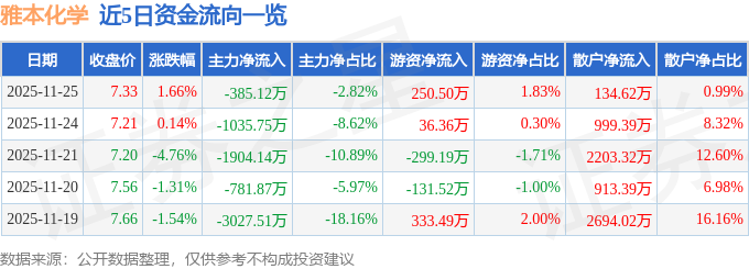 证券之星消息,截至2025年11月25日收盘,雅本化学(300261)报收于7.33元,上涨1.66%,换手率1.99%,成交量18.66万手,成交额1.37亿元。