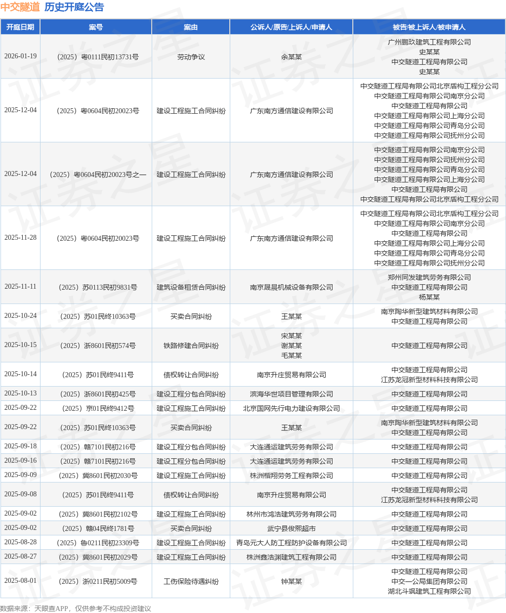 案号:(2025)粤0604民初20023号根据统计,近一年内以中交隧道工程局有限公司为当事人的历史开庭公告有72则,其中案由为“建设工程施工合同纠纷”的公告以17则居首,其次为“买卖合同纠纷”有14则,“建设工程分包合同纠纷”有13则。历史开庭公告(前20条)如下: