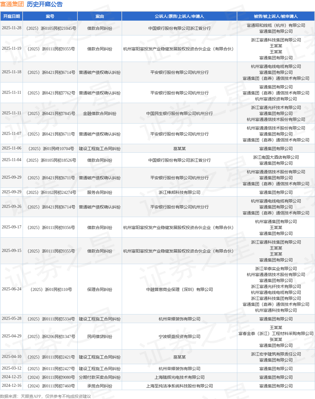 案号:(2025)浙0105民初21045号根据统计,近一年内以富通集团有限公司为当事人的历史开庭公告有20则,其中案由为“借款合同纠纷”的公告以5则居首,其次为“普通破产债权确认纠纷”有5则,“建设工程施工合同纠纷”有4则。历史开庭公告如下: