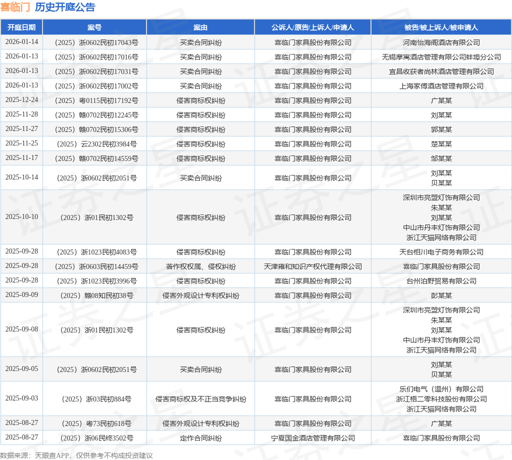 案号:(2025)赣0702民初12245号根据统计,近一年内以喜临门家具股份有限公司为当事人的历史开庭公告有58则,其中案由为“侵害商标权纠纷”的公告以20则居首,其次为“买卖合同纠纷”有15则,“侵害外观设计专利权纠纷”有6则。历史开庭公告(前20条)如下:
