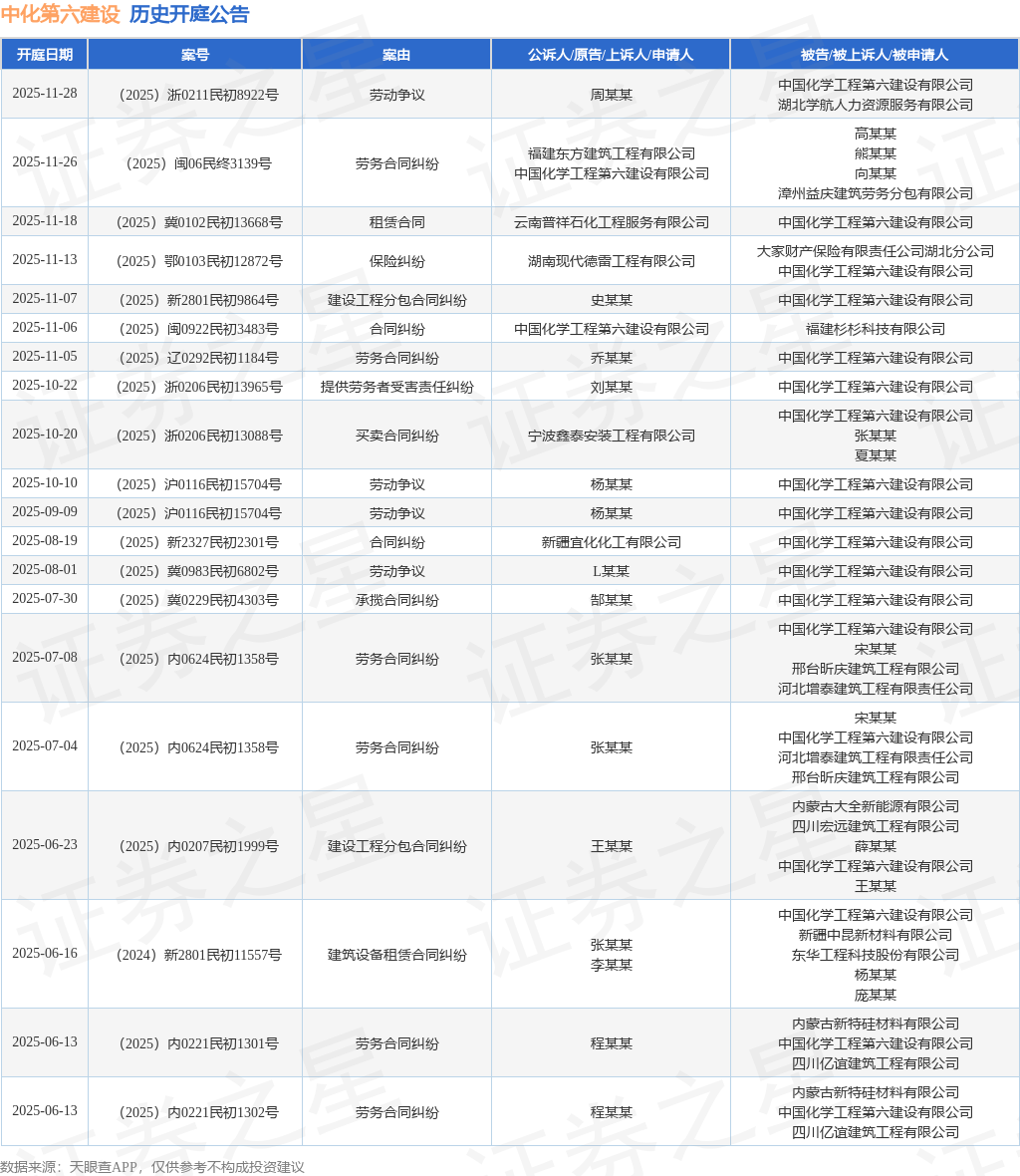 案号:(2025)浙0211民初8922号根据统计,近一年内以中国化学工程第六建设有限公司为当事人的历史开庭公告有80则,其中案由为“劳务合同纠纷”的公告以29则居首,其次为“建设工程施工合同纠纷”有11则,“劳动争议”有9则。历史开庭公告(前20条)如下: