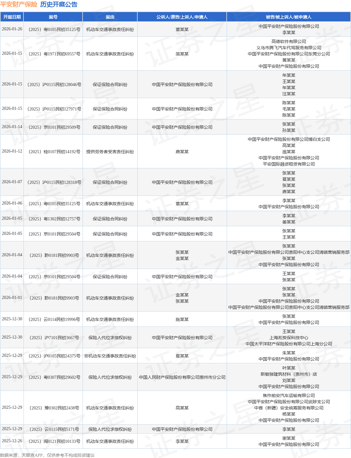 案号:(2025)湘0111民初15462号根据统计,近一年内以中国平安财产保险股份有限公司为当事人的历史开庭公告有2247则,其中案由为“机动车交通事故责任纠纷”的公告以1088则居首,其次为“保证保险合同纠纷”有275则,“保险人代位求偿权纠纷”有182则。历史开庭公告(前20条)如下:
