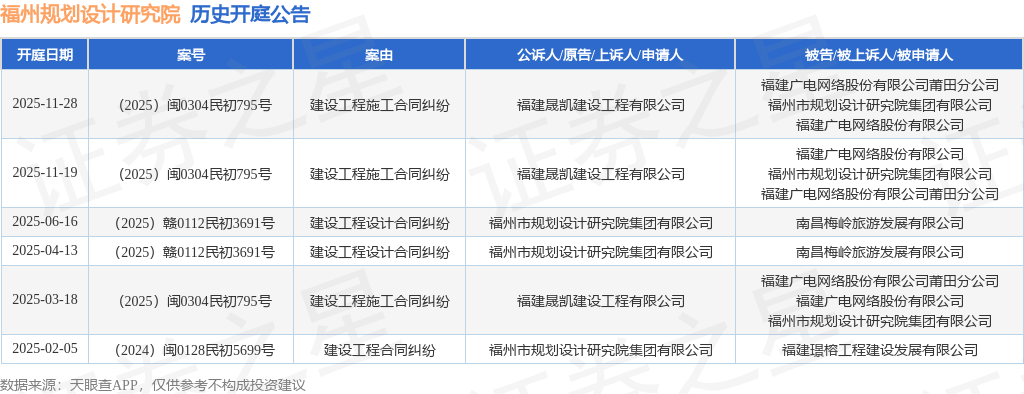 案号:(2025)闽0304民初795号根据统计,近一年内以福州市规划设计研究院集团有限公司为当事人的历史开庭公告有6则,其中案由为“建设工程施工合同纠纷”的公告以3则居首,其次为“建设工程设计合同纠纷”有2则,“建设工程合同纠纷”有1则。历史开庭公告如下: