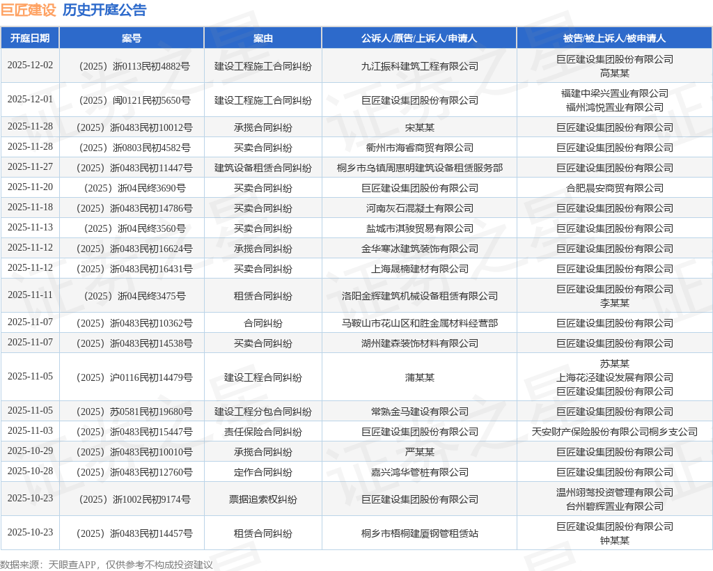 案号:(2025)浙0483民初10012号根据统计,近一年内以巨匠建设集团股份有限公司为当事人的历史开庭公告有229则,其中案由为“买卖合同纠纷”的公告以77则居首,其次为“合同纠纷”有35则,“建设工程施工合同纠纷”有30则。历史开庭公告(前20条)如下: