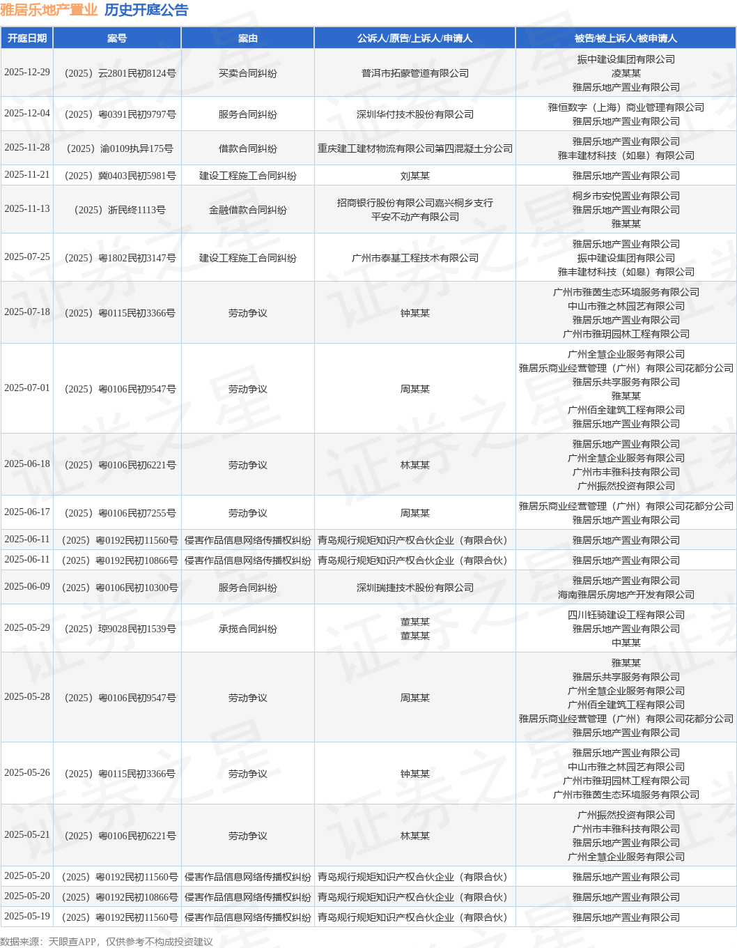 案号:(2025)渝0109执异175号根据统计,近一年内以雅居乐地产置业有限公司为当事人的历史开庭公告有43则,其中案由为“劳动争议”的公告以12则居首,其次为“侵害作品信息网络传播权纠纷”有6则,“股权转让纠纷”有4则。历史开庭公告(前20条)如下:
