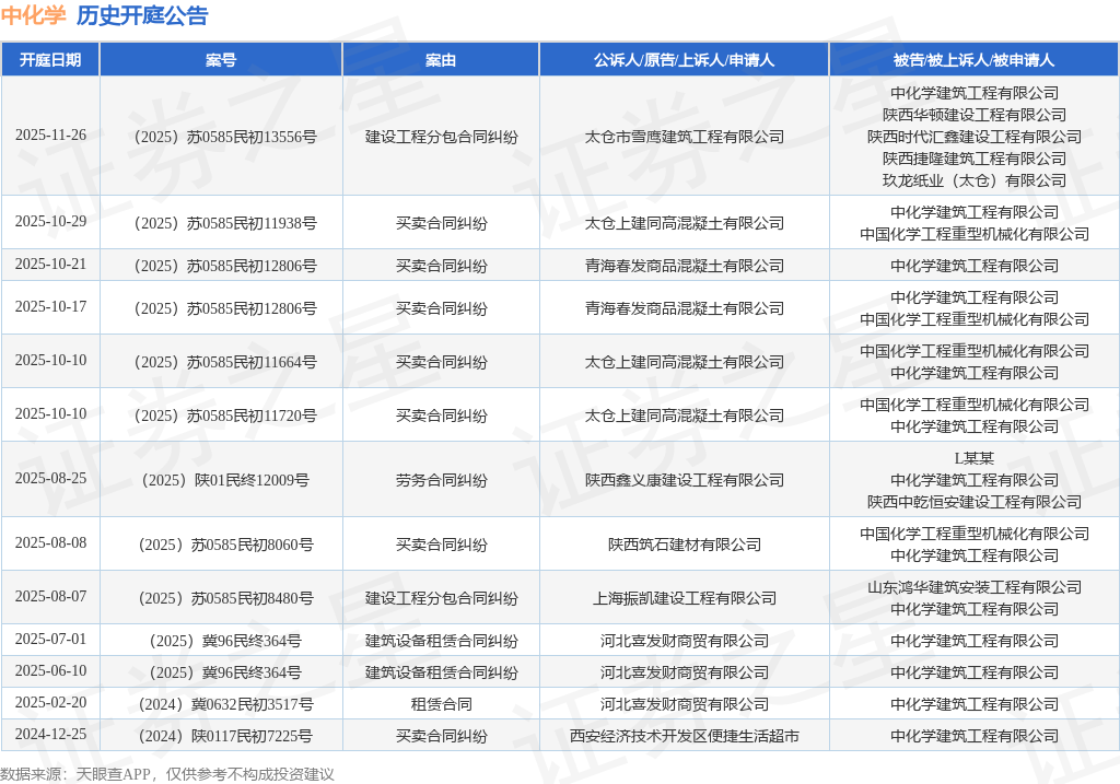 案号:(2025)苏0585民初13556号根据统计,近一年内以中化学建筑工程有限公司为当事人的历史开庭公告有13则,其中案由为“买卖合同纠纷”的公告以7则居首,其次为“建筑设备租赁合同纠纷”有2则,“建设工程分包合同纠纷”有2则。历史开庭公告如下: