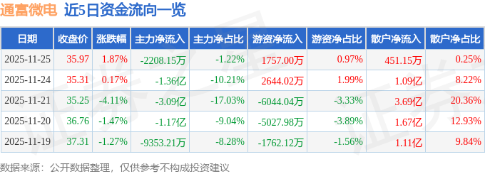 证券之星消息,截至2025年11月25日收盘,通富微电(002156)报收于35.97元,上涨1.87%,换手率3.31%,成交量50.16万手,成交额18.17亿元。