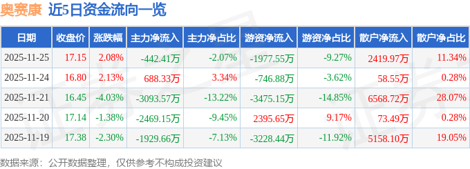 证券之星消息,截至2025年11月25日收盘,奥赛康(002755)报收于17.15元,上涨2.08%,换手率1.34%,成交量12.42万手,成交额2.13亿元。