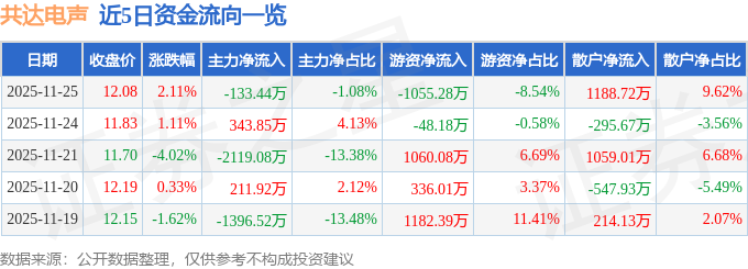 证券之星消息,截至2025年11月25日收盘,共达电声(002655)报收于12.08元,上涨2.11%,换手率2.84%,成交量10.27万手,成交额1.24亿元。