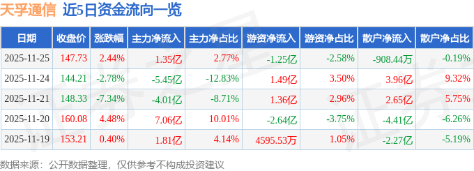 证券之星消息,截至2025年11月25日收盘,天孚通信(300394)报收于147.73元,上涨2.44%,换手率4.19%,成交量32.49万手,成交额48.61亿元。