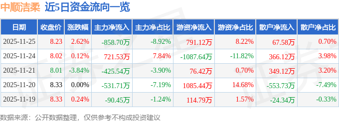 证券之星消息,截至2025年11月25日收盘,中顺洁柔(002511)报收于8.23元,上涨2.62%,换手率0.92%,成交量11.7万手,成交额9624.93万元。
