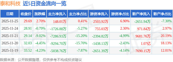 证券之星消息,截至2025年11月25日收盘,泰和科技(300801)报收于29.69元,上涨2.7%,换手率9.01%,成交量12.3万手,成交额3.63亿元。