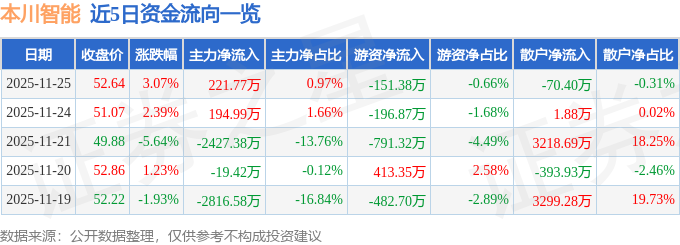 证券之星消息,截至2025年11月25日收盘,本川智能(300964)报收于52.64元,上涨3.07%,换手率7.86%,成交量4.33万手,成交额2.29亿元。