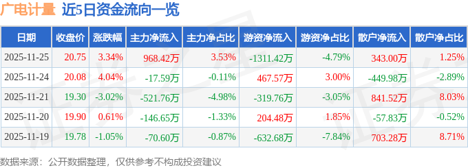 证券之星消息,截至2025年11月25日收盘,广电计量(002967)报收于20.75元,上涨3.34%,换手率2.44%,成交量13.19万手,成交额2.74亿元。