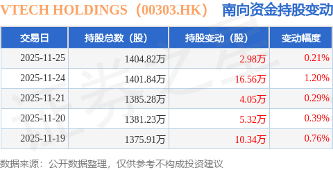 证券之星消息,11月25日南向资金增持2.98万股VTECH HOLDINGS(00303.HK)。近5个交易日中,获南向资金增持的有5天,累计净增持39.25万股。近20个交易日中,获南向资金增持的有18天,累计净增持34.49万股。截至目前,南向资金持有VTECH HOLDINGS(00303.HK)1404.82万股,占公司已发行普通股的5.54%。