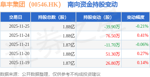 证券之星消息,11月25日南向资金减持39.9万股阜丰集团(00546.HK)。近5个交易日中,获南向资金增持的有3天,累计净增持103.0万股。近20个交易日中,获南向资金减持的有8天,累计净减持66.33万股。截至目前,南向资金持有阜丰集团(00546.HK)1.88亿股,占公司已发行普通股的7.48%。