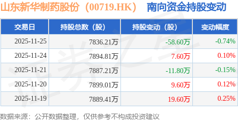 证券之星消息,11月25日南向资金减持58.6万股山东新华制药股份(00719.HK)。近5个交易日中,获南向资金减持的有2天,累计净减持33.6万股。近20个交易日中,获南向资金减持的有10天,累计净减持176.0万股。截至目前,南向资金持有山东新华制药股份(00719.HK)7836.21万股,占公司已发行普通股的40.17%。