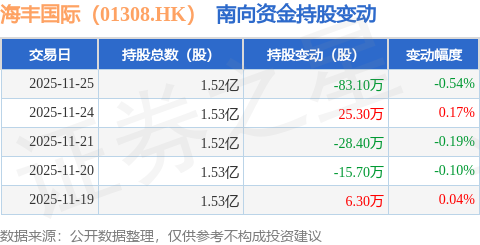 证券之星消息,11月25日南向资金减持83.1万股海丰国际(01308.HK)。近5个交易日中,获南向资金减持的有3天,累计净减持95.6万股。近20个交易日中,获南向资金增持的有11天,累计净增持60.46万股。截至目前,南向资金持有海丰国际(01308.HK)1.52亿股,占公司已发行普通股的5.61%。