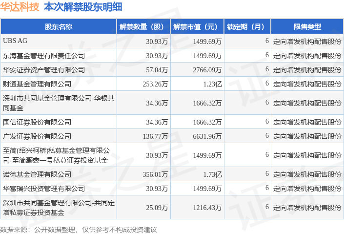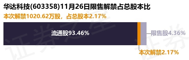 证券之星消息,根据市场公开信息整理,华达科技(603358)于11月26日将有1020.62万股限售股份解禁,为公司定向增发机构配售股份,占公司总股本2.17%。(本次数据根据历史公告整理得出,实际情况以上市公司最新公告为准)本次解禁后,公司还有2049.69万股限售股份,占总股本4.36%。具体如下图所示: