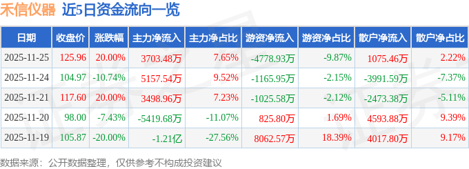 证券之星消息,截至2025年11月25日收盘,禾信仪器(688622)报收于125.96元,上涨20.0%,涨停,换手率5.68%,成交量4.01万手,成交额4.84亿元。