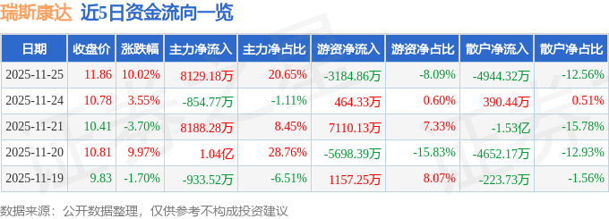 证券之星消息,截至2025年11月25日收盘,瑞斯康达(603803)报收于11.86元,上涨10.02%,涨停,换手率8.06%,成交量34.23万手,成交额3.94亿元。