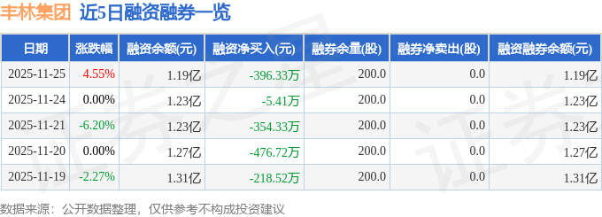 丰林集团融资融券信息显示,融资方面,当日融资买入608.74万元,融资偿还1005.07万元,融资净偿还396.33万元。融券方面,融券卖出0.0股,融券偿还0.0股,融券余量200.0股,融券余额0.05万元。融资融券余额1.19亿元。