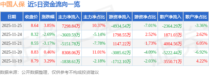 证券之星消息,截至2025年11月25日收盘,中国人保(601319)报收于8.64元,上涨3.85%,换手率0.23%,成交量82.31万手,成交额7.04亿元。