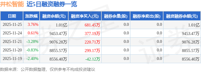 井松智能融资融券信息显示,融资方面,当日融资买入868.27万元,融资偿还186.82万元,融资净买入681.45万元,连续3日净买入累计1279.36万元。融券方面,融券卖出0.0股,融券偿还0.0股,融券余量0.0股,融券余额0.0万元。融资融券余额1.01亿元。