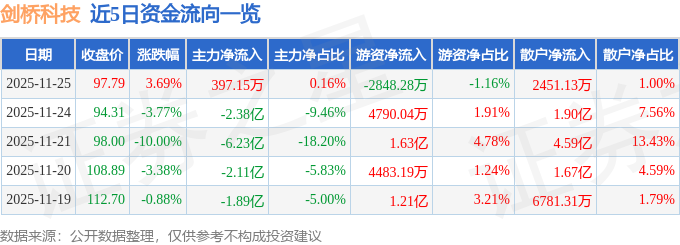 证券之星消息,截至2025年11月25日收盘,剑桥科技(603083)报收于97.79元,上涨3.69%,换手率9.1%,成交量25.09万手,成交额24.57亿元。