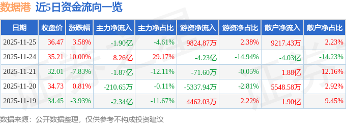证券之星消息,截至2025年11月25日收盘,数据港(603881)报收于36.47元,上涨3.58%,换手率15.83%,成交量113.75万手,成交额41.31亿元。