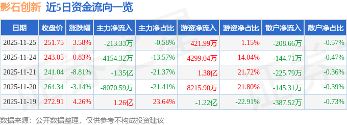 证券之星消息,截至2025年11月25日收盘,影石创新(688775)报收于251.75元,上涨3.58%,换手率4.79%,成交量1.46万手,成交额3.66亿元。