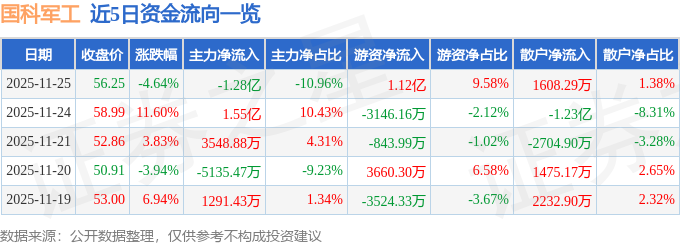 证券之星消息,截至2025年11月25日收盘,国科军工(688543)报收于56.25元,下跌4.64%,换手率17.83%,成交量20.68万手,成交额11.66亿元。
