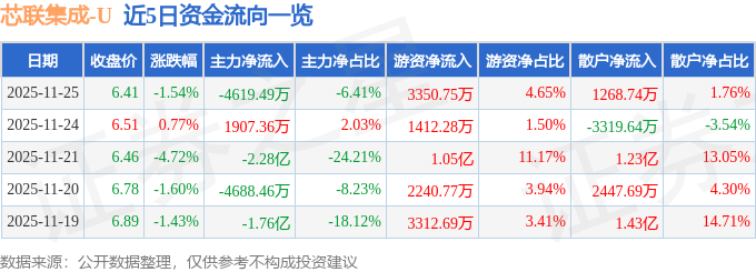 11月25日的资金流向数据方面,主力资金净流出4619.49万元,占总成交额6.41%,游资资金净流入3350.75万元,占总成交额4.65%,散户资金净流入1268.74万元,占总成交额1.76%。