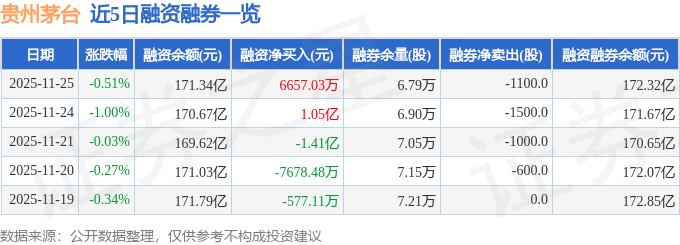 贵州茅台融资融券信息显示,融资方面,当日融资买入3.41亿元,融资偿还2.74亿元,融资净买入6657.03万元。融券方面,融券卖出1200.0股,融券偿还2300.0股,融券余量6.79万股,融券余额9802.67万元。融资融券余额172.32亿元。
