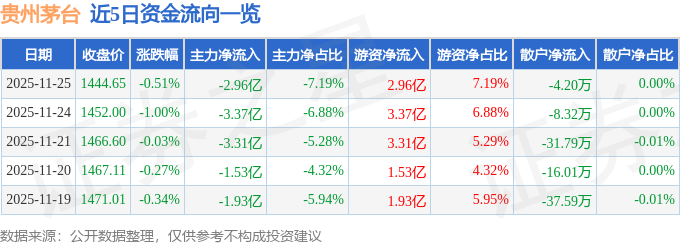 证券之星消息,截至2025年11月25日收盘,贵州茅台(600519)报收于1444.65元,下跌0.51%,换手率0.23%,成交量2.84万手,成交额41.2亿元。
