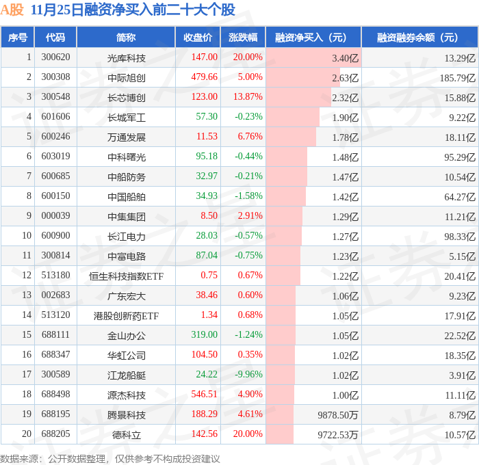 A股融资净买入前三分别为:光库科技(300620)融资净买入3.4亿元、中际旭创(300308)融资净买入2.63亿元、长芯博创(300548)融资净买入2.32亿元,前20具体见下表: