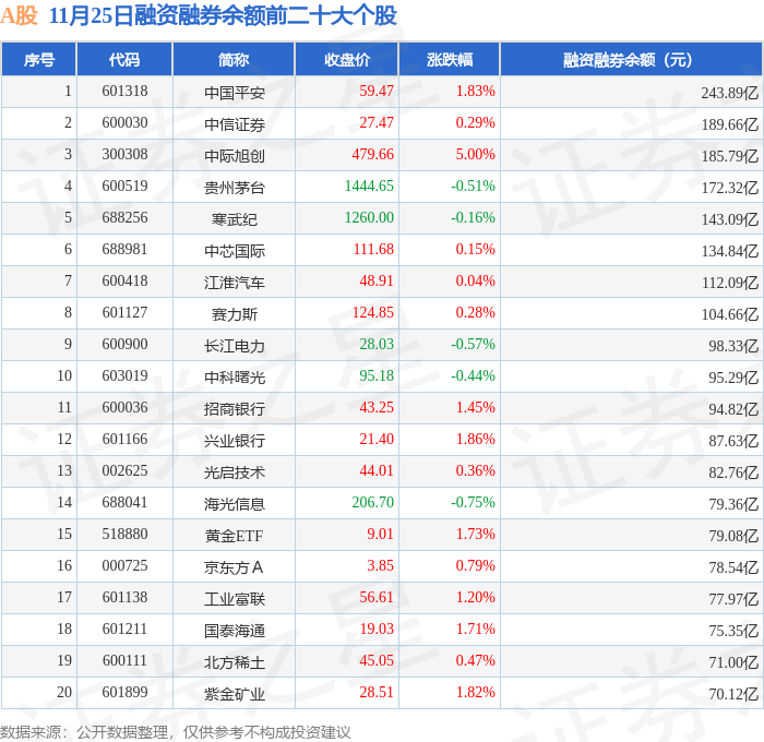 A股融资融券余额前三分别为:中国平安(601318)融资融券余额243.89亿元、中信证券(600030)融资融券余额189.66亿元、中际旭创(300308)融资融券余额185.79亿元,前20具体见下表: