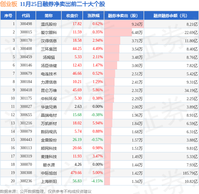 创业板融券净卖出前三分别为:温氏股份(300498)融券净卖出9.24万股、爱尔眼科(300015)融券净卖出6.48万股、汉得信息(300170)融券净卖出3.71万股,前20具体见下表: