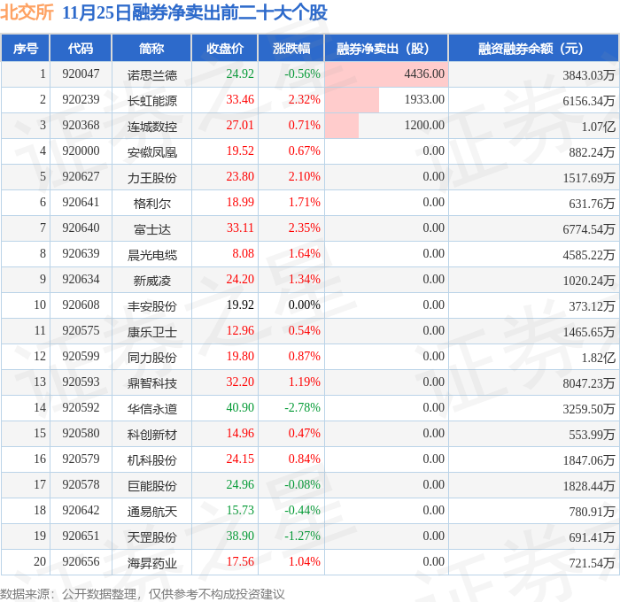 北交所融券净卖出前三分别为:诺思兰德(920047)融券净卖出4436股、长虹能源(920239)融券净卖出1933股、连城数控(920368)融券净卖出1200股,前20具体见下表: