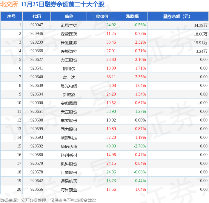 北交所融券余额前三分别为:诺思兰德(920047)融券余额34.39万元、森萱医药(920946)融券余额18万元、长虹能源(920239)融券余额15.91万元,前20具体见下表: