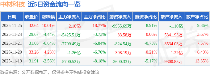 证券之星消息,截至2025年11月25日收盘,中材科技(002080)报收于32.64元,上涨10.01%,涨停,换手率2.08%,成交量34.92万手,成交额11.18亿元。
