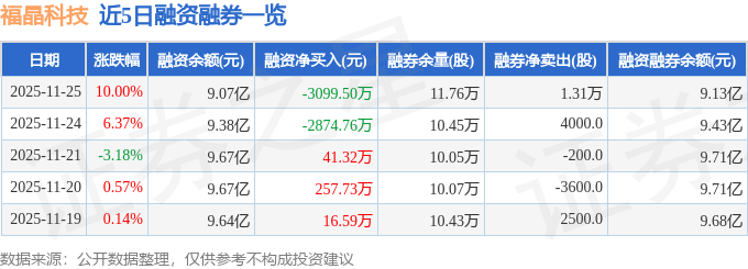 福晶科技融资融券信息显示,融资方面,当日融资买入9756.18万元,融资偿还1.29亿元,融资净偿还3099.5万元。融券方面,融券卖出1.31万股,融券偿还0.0股,融券余量11.76万股,融券余额561.42万元。融资融券余额9.13亿元。