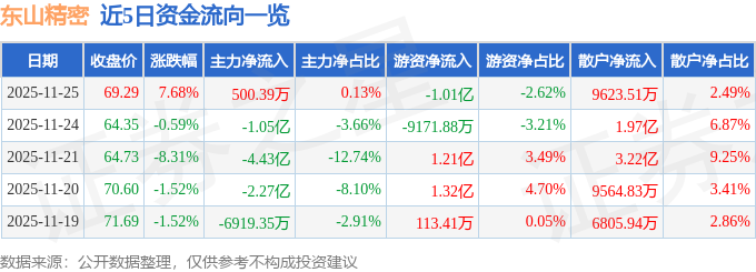 证券之星消息,截至2025年11月25日收盘,东山精密(002384)报收于69.29元,上涨7.68%,换手率4.06%,成交量56.35万手,成交额38.7亿元。