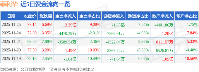 11月25日的资金流向数据方面,主力资金净流入2.29亿元,占总成交额9.08%,游资资金净流出1.85亿元,占总成交额7.34%,散户资金净流出4401.86万元,占总成交额1.75%。