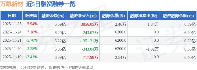 万凯新材融资融券信息显示,融资方面,当日融资买入8453.93万元,融资偿还4597.87万元,融资净买入3856.05万元。融券方面,融券卖出1.84万股,融券偿还0.0股,融券余量2.46万股,融券余额44.33万元。融资融券余额6.59亿元。